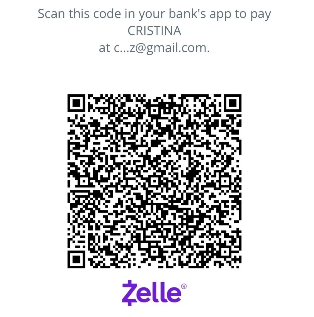 Zelle: From within your mobile banking app, go to zend money with Zelle page and enter cristina.rose.ortiz@gmail.com as Recipient,, or from the recipients page click the QR scanner and scan Zelle code below.